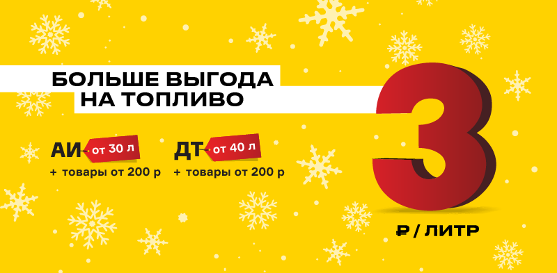 +3 балла с каждого литра топлива при покупке бензина (АИ) от 30 л или дизельного топлива (ДТ) от 40 л вместе с сопутствующими товарами на сумму от 200 руб. в одном чеке.