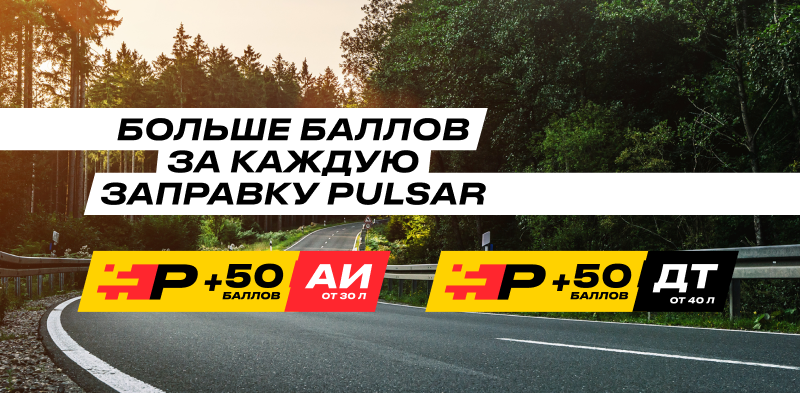 + 50 баллов за каждую заправку PULSAR: АИ от 30л или ДТ от 40л в чеке.